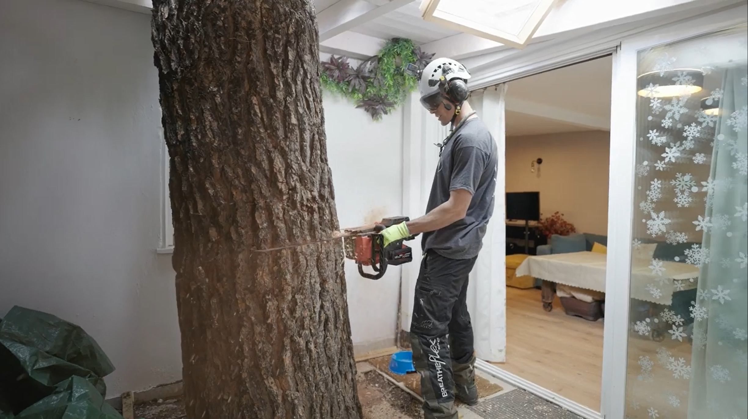 Once the external portions were successfully removed, the team continued their work inside the house. Here, they cut through the remaining trunk sections that had grown through the outbuilding, working in more confined spaces that demanded even greater precision, with only 2 cms of tolerance to remove the trunk through the roof.