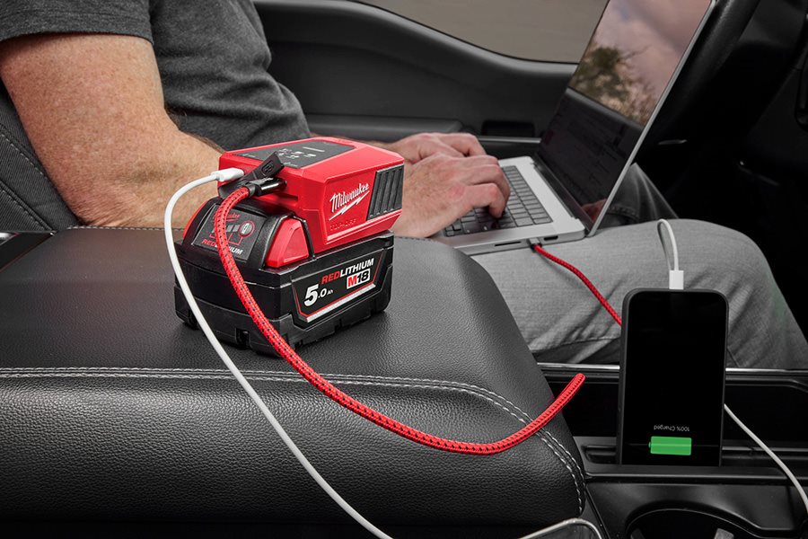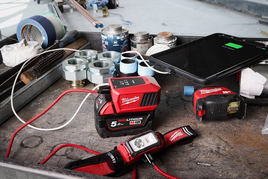 Charge an M18 battery with the M18 TOP-OFF Mini Charger (100 W port) and add a personal light or device on the secondary port (20 W).